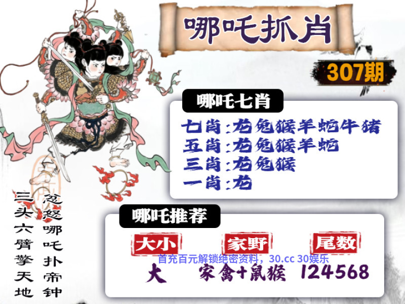 | 307期: ①七肖中特:龙兔猴羊蛇牛猪 ②大小中特:大数 ③家野+2肖:家禽+鼠猴 ④精准六尾:124568 |